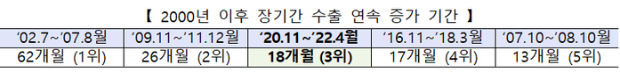 ▲ 2000년 이후 장기간 수출 연속 증가 기간. [산업통상자원부 제공] |