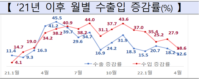 ▲ 2021년 이후 월별 수출입 증감률 추이. [산업통상자원부 제공] |