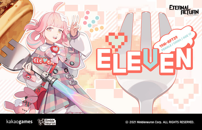 님블뉴런(대표 김남석)이 개발하고 카카오게임즈(대표 남궁훈, 조계현)가 함께 서비스하는 PC온라인 전략생존게임 ‘이터널 리턴(Eternal Return: Black Survival, 영원회귀)’이 서른 번째 신규 캐릭터 ‘일레븐(Eleven)’을 27일 출시했다.