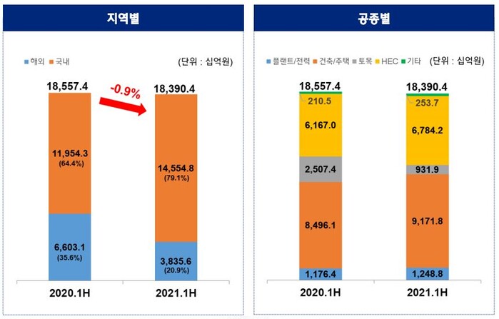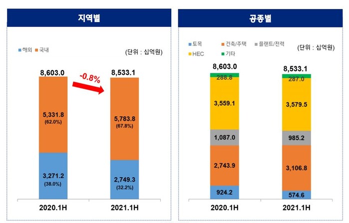 상반기 연결 기준 신규 수주는 18조 3904조 원으로 지난해 같은 기간보다 0.9% 감소했지만, 연초 목표치인 25조 4000억 원에서 72.4%를 달성한 것으로 나타났다. 같은 기간 국내 수주는 주택 부문 호황 등에 힘입어 79.1%로 전년도 64.4%보다 14.7%포인트 늘었다.