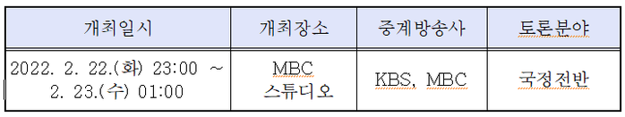 초청대상에 포함되지 아니하는 후보자를 대상으로 한 토론회는 2월 22일(화) 오후 11시부터 2시간 동안 좌식으로 진행한다.