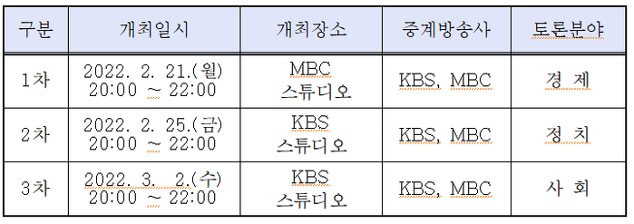 3회의 ‘초청대상’ 후보자토론회는 2월 21일(월) 경제분야를 시작으로, 2월 25일(금)엔 정치분야, 3월 2일(수)엔 사회분야로 각각 오후 8시부터 2시간 동안 입식 토론으로 진행된다.