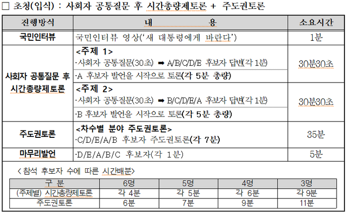 위원회는 세 차례의 초청대상 후보자토론회 모두 ‘시간총량제토론’과 ‘주도권토론’ 방식으로 진행하기로 결정했다고 밝혔다.