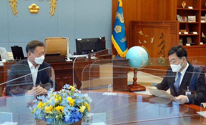 ▲ 문재인 대통령이 18일 오후 청와대 여민관 집무실에서 김오수 검찰총장을 면담하고 있다. [청와대 제공] |
