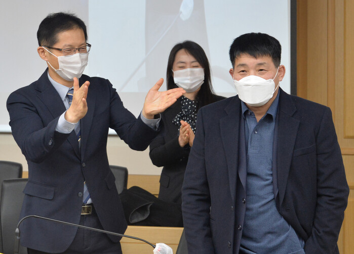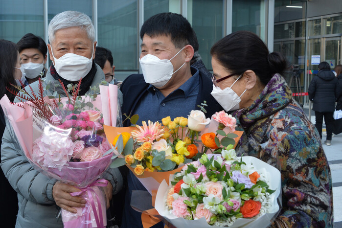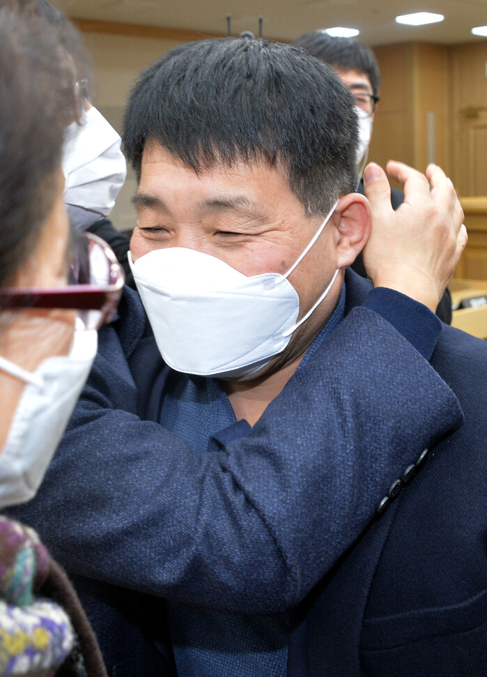 ▲ 17일 오후 경기도 수원시 영통구 수원지방법원에서 열린 이춘재 연쇄살인 8차 사건 재심 선고공판에서 재심 청구인 윤성여 씨가 무죄를 선고받고 축하를 받고 있다. [사진공동취재단] |