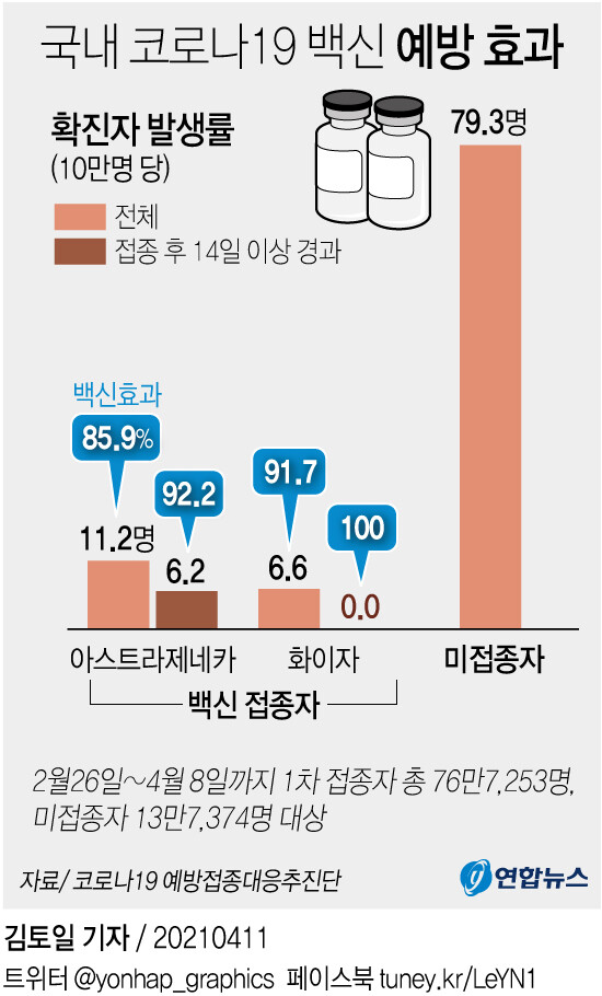 이에 따르면, 지난 2월 26일부터 시행된 코로나19 백신 1분기 전체 접종대상자에서 확인한 백신효과(VE)는 아스트라제네카 백신이 85.9%, 화이자 백신이 91.7%이었다.
