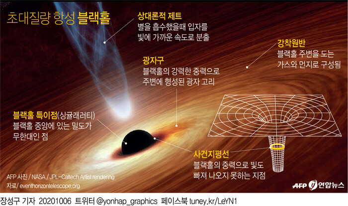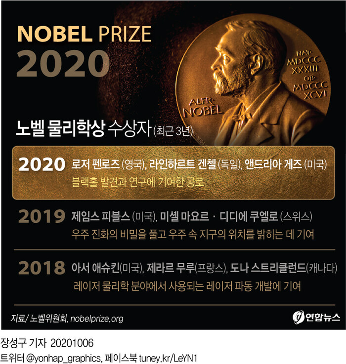 스웨덴 왕립과학원 노벨위원회는 6일(현지시간) 2020년 노벨 물리학상 수상자로 블랙홀의 존재를 이론적으로 증명한 영국의 로저 펜로즈 교수(89·옥스포드대)와, 별의 관측으로부터 은하의 중심에 ‘보이지 않는 극히 무거운 물질'(초대질량 블랙홀)이 있다는 사실을 밝혀낸 독일 막스플랑크 외계물리학연구소 라인하르트 겐첼 소장(68·UC버클리)과 미국의 앤드리아 게즈 교수(55·UCLA) 등 3명이 결정됐다고 발표했다.