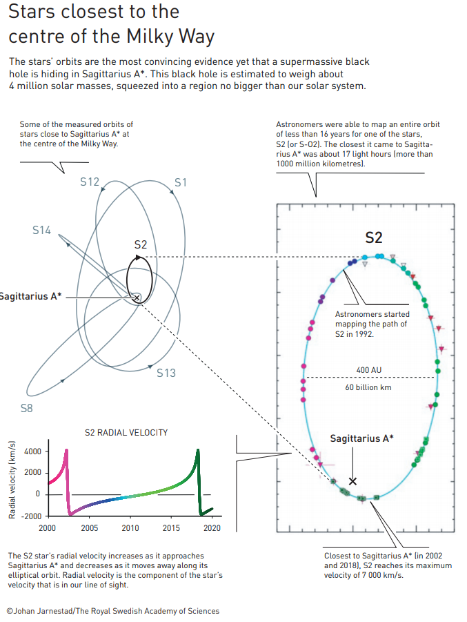 | ▲ 은하 중심부에 가장 근접한 별들.' 궁수자리 A*(Sagittarius A*)에 초대질량 블랙홀'이 있다. [출처= 노벨상 홈페이지] |