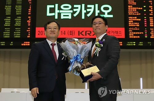 ▲ 2014년 10월14일 한국거래소에서 열린 다음카카오 합병 상장행사에서 최세훈 다음카카오 공동대표(오른쪽)가 김재준 코스닥시장위원회 위원장으로부터 합병상장패를 받은 뒤 포즈를 취하고 있다. [사진=연합뉴스] |