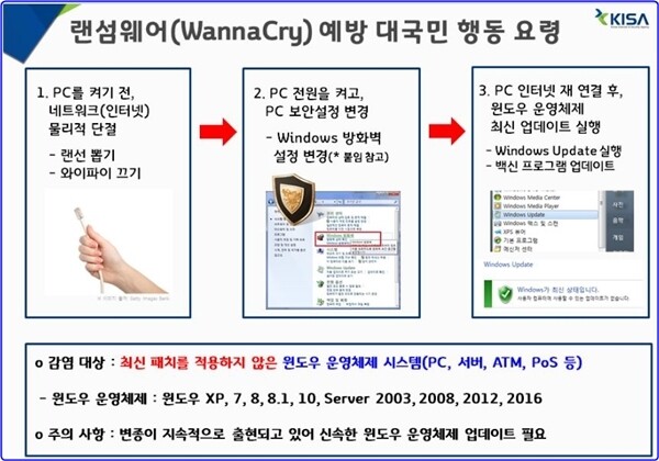 주말을 보내고 14일 월요일 회사에 출근하면서 한국인터넷진흥원이 'SMB 취약점을 악용한 랜섬웨어 방지 대국민 행동 요령'을 공지하고 있는 '보호나라' 접속이 폭주해 마비 상태가 될 정도다.