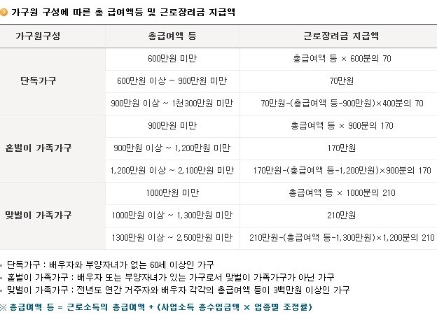 가구당 최대 210만원까지 지급되는 2015 근로장려금은 근로자 뿐만 아니라 저소득 자영업자와 기초생활수급자를 지원대상에 추가했다. 또 저소득가구의 자녀양육 지원을 위해 올해 처음 부부합산 연간소득 4천만원 이하 가구에 대해 자녀 1인당 최대 50만원의 자녀장려금을 지급한다.