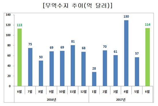 6월 수입액은 지난해 같은달 대비 18.0% 늘어난 400억달러를 기록했다. 이에 따라 무역수지는 114억달러 흑자를 기록, 65개월째 무역수지 흑자 퍼레이드를 이어갔다.