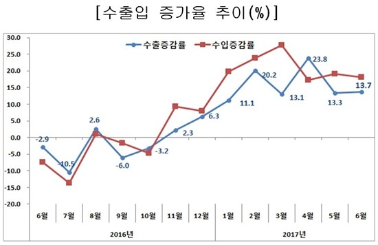 6월 수출액 514억달러는 지난해 같은 달보다 13.7% 상승한 것으로, 올 들어 6개월 연속 두 자릿 수 증가율을 기록했다. 수출이 8개월 연속 증가한 것은 2011년 12월 이후 66개월 만이다.