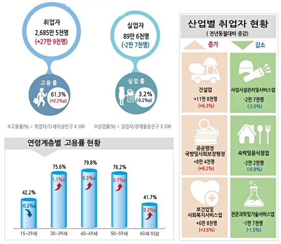 고용률은 61.3%로 전년 같은 기간 대비 0.2%포인트 상승했다. 경제협력개발기구(OECD) 비교 기준인 15∼64세 고용률은 66.9%로 전년 동월 대비 0.4%포인트 올랐다. 반면 청년 고용률은 42.2%로 0.2%포인트 떨어졌다.