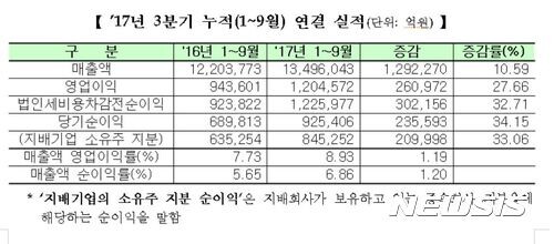 연결제무재표를 제출하지 않은 기업과 지주회사 전환 등으로 분할, 합병이 진행돼 실적집계에서 빠진 기업들을 더하면 3분기 상장사(코스피, 코스닥)들의 영업이익은 130조원을 훌쩍 넘었다는 것이 증권가의 분석이다.