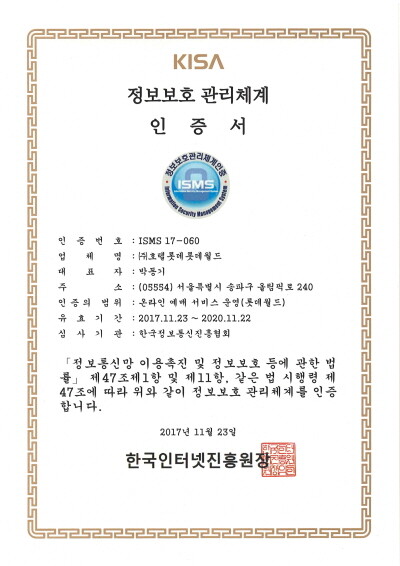 2월부터 약 9개월간의 탄탄한 준비 과정을 거친 결과 롯데월드는 온라인 예매 서비스 운영 전반에 대한 정보보호 관리체계 인증을 획득할 수 있었다.