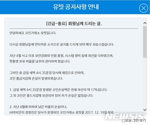 유빗거래소는 19일 홈페이지를 통해 "이날 오전 4시 35분 해킹으로 인해 코인 출금지갑에 손실이 발생했다"고 밝혔다. 더불어 "손실액은 전체의 17% 가량이며 그 외 코인은 콜드지갑에 보관되어 추가 손실은 없다"고 설명했다.