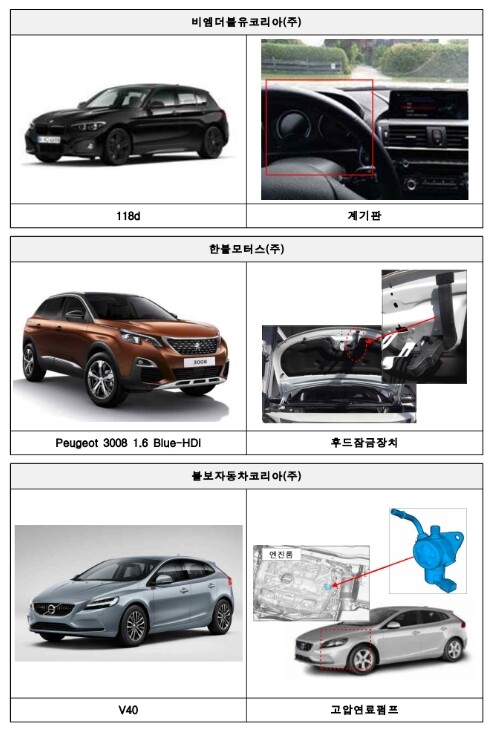 한불모터스에서 수입해 판매한 푸조 3008 1.6 블루-HDi 등 4개 차종 245대는 엔진룸 덮개(후드)에 달린 잠금장치의 결함으로 주행 중 엔진룸 덮개가 열릴 수 있다. 대상 차량은 22일부터 한불모터스 서비스센터에서 무상 수리를 받을 수 있다.