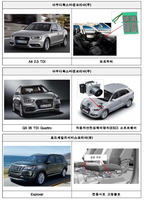 아우디 A4 2.0 TDI 등 13개 차종 4908대는 공조장치 내부 보조히터가 전기 커넥터의 결함으로 과열될 수 있다. 이로 인해 보조히터가 작동하지 않거나 화재가 발생할 가능성이 확인됐다.