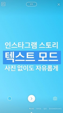 텍스트 모드는 스토리의 카메라 종류 중 ‘텍스트’를 선택해 사용하면 된다. 왼쪽 아래의 동그라미를 터치해 배경을 선택하고 텍스트 입력 화면에서 글씨 색깔을 고른 후 손가락으로 크기를 늘리고 줄이는 등 텍스트를 편집할 수 있다.