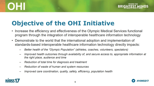 OHI는 비영리기관인 HIMSS(세계의료정보관리시스템학회)와 SNOMED(표준의료용어) 인터내셔널이 후원하는 디지털 헬스 업계 이니셔티브로, 올림픽 대회를 통해 전세계 의료 정보가 끊김없이 교환되고 활용되는 것을 도모하고자 만들어졌다.