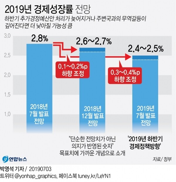 [메가경제 장찬걸 기자] 지난 3일 정부가 올해 목표 경제성장률 전망치를 2.4~2.5%로 하향조정한 가운데 대표적인 해외 투자은행과 국제 신용평가사도 잇따라 전망치를 낮췄다. 한국에 대한 일본의 반도체 소재 수출규제도 영향을 미친 것으로 보인다.