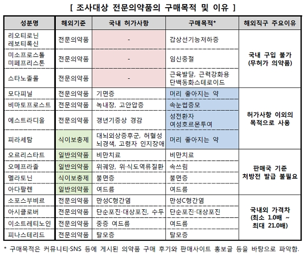이번 조사는 15종 제품을 각 2회씩 주문하는 방식으로 이뤄졌으며, 조사대상 15종 제품은 국내기준으로는 모두 성분상 전문의약품이지만, 개별 판매국 기준으로는 전문의약품 10종, 일반의약품 3종, 식이보충제 2종이었다.