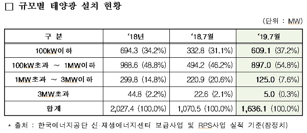 올해 7월 현재 100kW이하 609MW, 100kW초과 1MW이하 897MW, 1MW초과 3MW이하 125MW, 3MW 초과 5MW로 잠정 집계됐다.