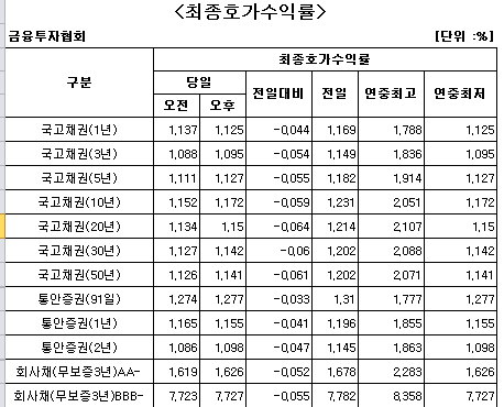 20년물, 30년물, 50년물은 각각 6.4bp, 6.0bp, 6.1bp 하락해 연 1.150%, 1.142%, 1.141%로 마감했다.