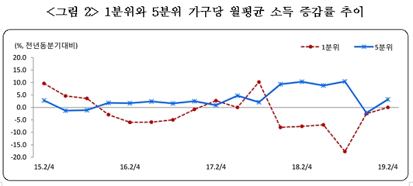 차하위 계층인 소득 하위 20∼40%(2분위), 중간 계층인 소득 상위 40∼60%(3분위), 차상위 계층인 소득 상위 20∼40%(4분위) 가계의 명목소득은 1년 전보다 각각 4.0%, 6.4%, 4.0%씩 늘어 전체 가계의 명목소득 증가율(3.8%)을 상회했다.