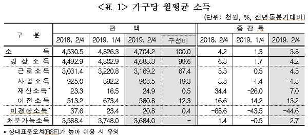 재산소득은 2만4천900원으로 7.0% 증가했고, 생산활동을 하지 않아도 정부가 무상으로 보조하는 소득 등을 뜻하는 이전소득은 58만800원으로 13.2% 늘었다.