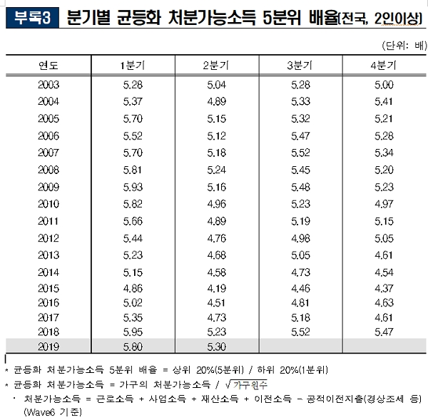 2019년 2분기 가구원 2인 이상 일반 가구의 균등화 처분가능소득 5분위 배율은 5.30배로 지난해 2분기(5.23배)보다 0.07배포인트(p) 상승했다. 2분기 기준으로는 집계를 시작한 2003년 이래 최고치다.