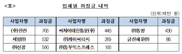 업체별 과징금 내역을 보면, 한진이 7억600만 원으로 가장 많고, 이어 셋방(5억3200만 원), 선광(5억6000만 원), CJ대한통운(4억4500만 원), KCTC(2억6900만 원), 동부익스프레스(1억 원), 동방(4억3000만 원), 금진해운(8600만 원) 순이다.