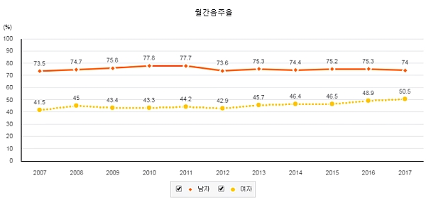 [메가경제 유지훈 기자] 국민건강통계에 따르면, 최근 1년 동안 한 달에 1회 이상 음주한 비율을 가리키는 ‘월간 음주율’의 경우, 2017년 우리나라 남성 74%, 여성 50.5%에 달했다. 남성 음주율은 횡보상태지만 여성음주율은 다소 증가하는 추세다.