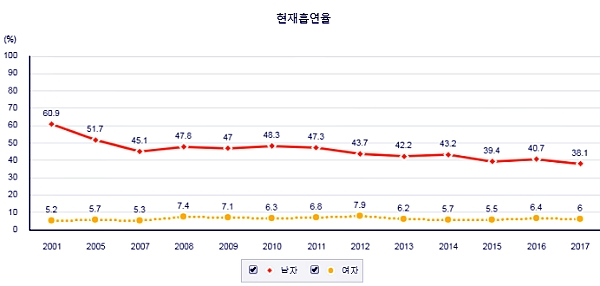 또, 평생 담배 5갑(100개비) 이상 피웠고 현재 담배를 피우는 만 19세 이상 성인들을 대상으로 조사한 현재흡연율에서는, 2017년 남성 38.1%, 여성 6%로 나타났다. 2001년 남성 흡연율이 60.9%에 이르렀던 것에 비하면 많이 줄어들었지만 여전히 흡연인구가 적지 않다.