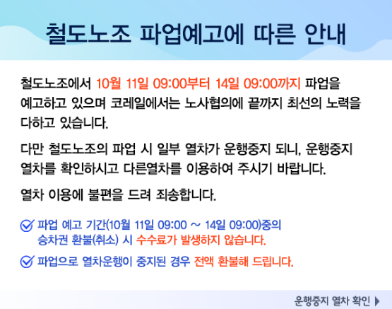 국토부는 철도공사 노조의 파업 예고와 관련, 열차 이용 승객들에게 운행 여부를 확인한 뒤 예매를 취소하라고 10일 당부했다.