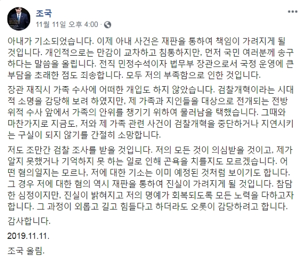 “아내가 기소되었습니다”로 첫 문장을 시작한 조 전 장관은 “이제 아내 사건은 재판을 통하여 책임이 가려지게 될 것입니다. 개인적으로는 만감이 교차하고 침통하지만, 먼저 국민 여러분께 송구하다는 말씀을 올립니다. 전직 민정수석이자 법무부 장관으로서 국정 운영에 큰 부담을 초래한 점도 죄송합니다. 모두 저의 부족함으로 인한 것입니다”라고 서두를 꺼냈다.