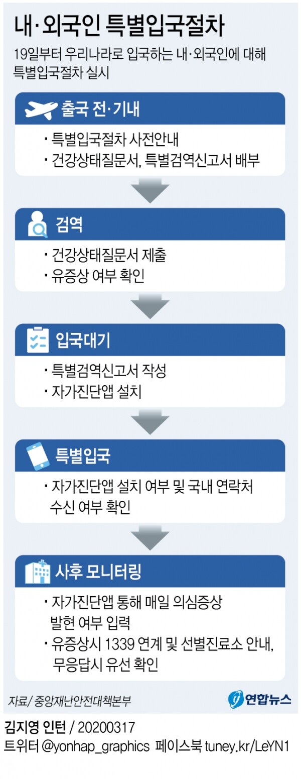 특별입국절차가 전세계로 넓혀짐에 따라, 19일 0시부터 국내 입국자는 건강상태질문서 및 발열 여부 확인 후, 국내 체류지 주소와 수신 가능한 연락처가 확인돼야 입국이 가능하게 되며, 입국 후에도 모바일 자가진단 앱을 통해 14일간 증상여부를 등록해야 한다.