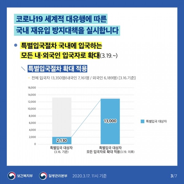 코로나바이러스감염증-19 중앙재난안전대책본부(중대본)는 “이탈리아, 프랑스, 스페인 등 유럽지역과 미국, 중동지역에서 코로나 19 환자가 급증하고 있으며, 최근 검역과정 및 입국 후 지역사회에서 해외 입국자 확진사례가 증가하고 있어 19일 0시를 기해 전세계 모든 입국자에 대해 특별입국절차를 확대 시행한다”고 18일 밝혔다.