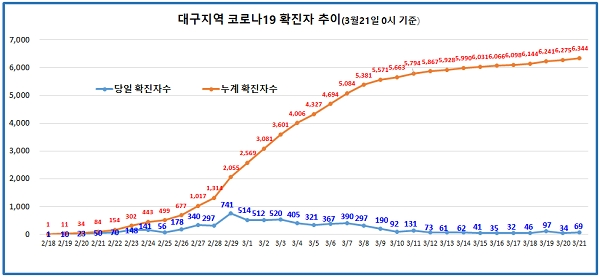 지역별 누적 확진자는 대구 6387명을 비롯, 경북 1254명, 경기 337명, 서울 324명, 충남 120명, 부산 108명, 경남 88명, 세종 41명, 인천 40명, 울산 36명, 충북 35명, 강원 30명, 대전 24명, 광주 19명, 전북 10명, 전남 6명, 제주 4명 등이다.