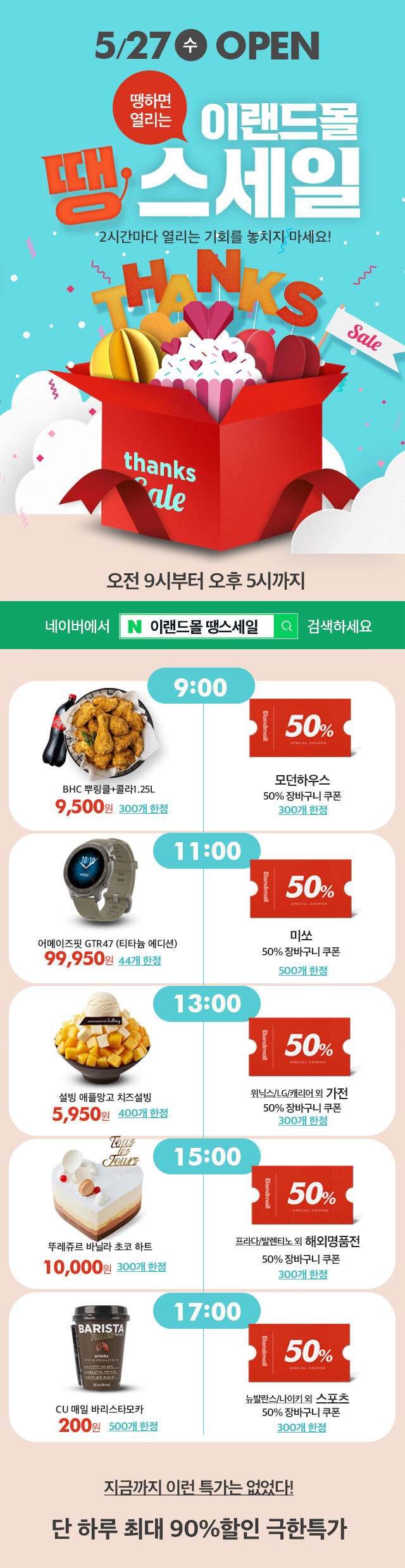 우선 오전 9시부터 오후 5시까지 진행되는 이랜드몰 ‘땡스세일’은 두 시간마다 선착순 고객에 한해 인기상품을 초특가에 아래와 같이 제공한다.