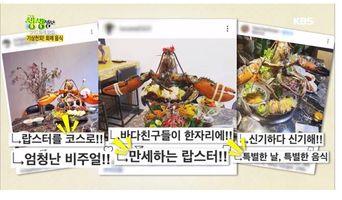 3일 오후 방송된 KBS2TV ‘생생정보’ 1080회에는 유PD의 리얼현장, SNS 화제 맛집, 장사의 신, 미스터Lee의 사진 한컷 대한민국, 전국 명물 스타 등이 소개됐다. 특히 이날 ’SNS 화제 맛집’ 코너에서는 서울 종로 익선동 맛집으로 비주얼과 맛을 사로잡은 만세 하는 랍스터가 전파를 탔다.