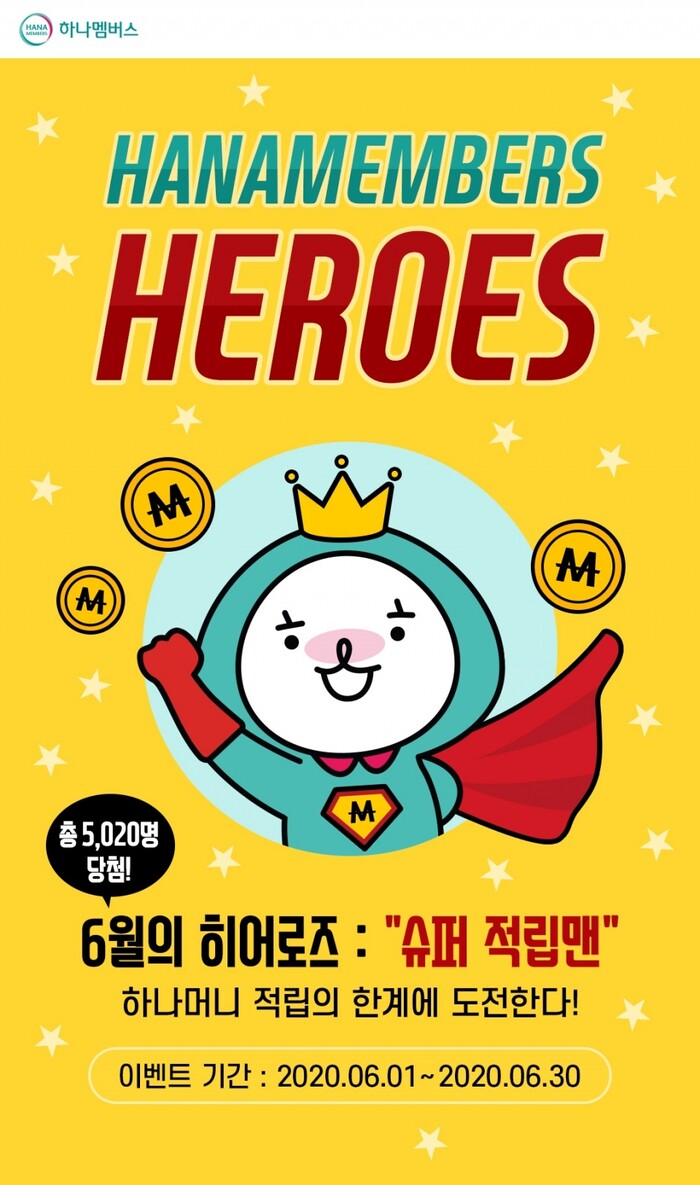 [메가경제= 장주희 기자] 하나금융그룹(회장 김정태)은 손님이 하나머니를 쉽고 간편하게 적립 받을 수 있는 ‘무료적립’ 서비스 제공을 기념해 6월 한 달 간 ‘하나멤버스 히어로즈 : 슈퍼 적립맨’ 이벤트를 실시한다고 9일 밝혔다.