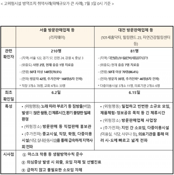 방대본은 이날 브리핑에서 최근 집단감염 발생 사례 중 피해규모가 컸던 서울 방문판매(리치웨이) 및 대전 방문판매(101세홈닥터, 힐링랜드23, 자연건강힐링센터 등) 관련 사례를 분석하고 주의를 당부했다.