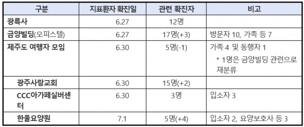 광주 사찰 광륵사와 관련해서는 8명이 추가 확진되어 총 57명으로 늘었다. 추가 확진자는 한울요양원 관련 4명, 금양빌딩 관련 2명, 사랑교회 관련 접촉자 2명이다.